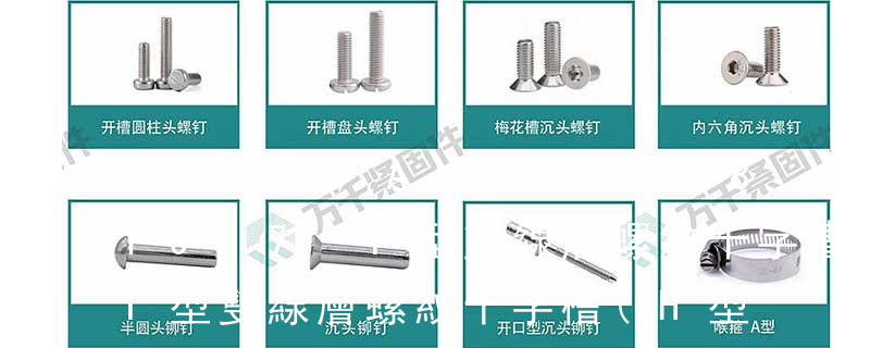 1、Flat:平頭 (鎖入后,頂部與工作件齊平)2、Oval:色拉頭、O頭、半沉頭 3、Round:圓頭 4、Pan:圓扁頭 5、Truss:大圓扁頭 6、Hex:六角頭 A-5:Finish Code/外觀處理。公制自攻螺絲 :于品名后方直接標示 Tapp 開槽圓柱頭螺釘 Slotted cheese head screws 開槽盤頭螺釘 Slotted pan head screws 單耳止動墊圈 Tab washers 開口銷 Split cooter pins 開槽半沉頭木螺釘 Slotted raised csk head wood screws 開槽半圓頭木螺釘 Slotted