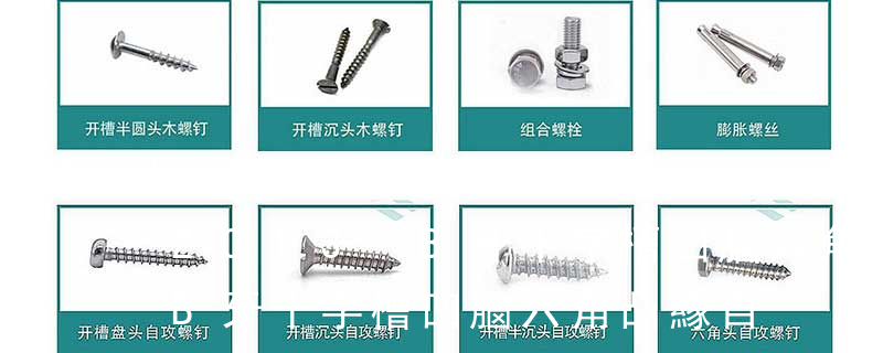 1)十字槽盤頭自鉆自攻螺釘 2)十字槽沉頭自鉆自攻螺釘 3)十字槽半沉頭自鉆自攻螺釘,跟上面沉頭螺絲接近。4)六角法蘭面自鉆自攻螺釘 5)六角凸緣自鉆 自攻螺釘根據(jù)材質(zhì)可分為:鋼材1022A,不銹鐵410,不銹鋼304